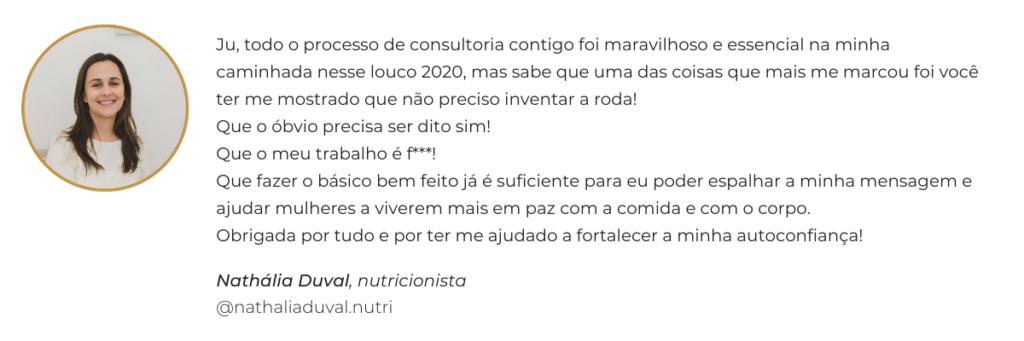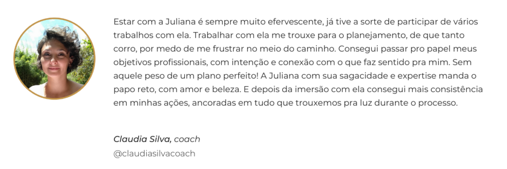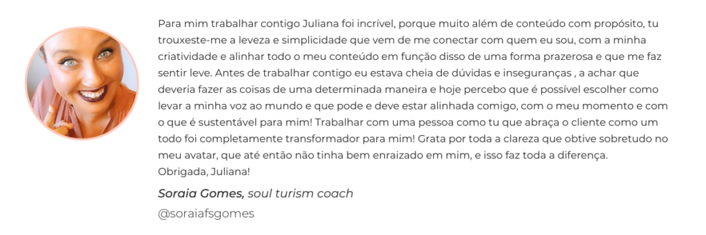 Neste processo individual, vou te acompanhar passo a passo para você definir: quem você é (mapear suas fortalezas, desejos, histórias e conhecimentos, o que de você quer colocar no mundo), com quem você vai se conectar (definição de quem é seu cliente ideal), o que você vai colocar no mundo (seu método).